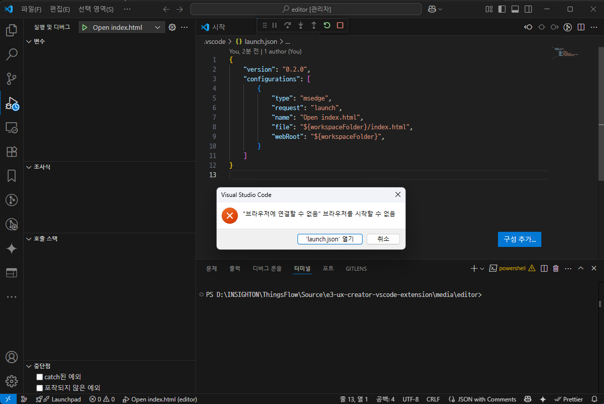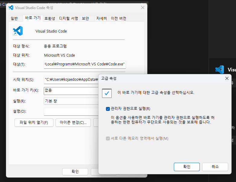 VS Code브라우저 미리 보기 안됨아래와 같이 INDEX.html 을 띄우는게 안된다. 되다 안된다 한다(?) 일단 내경우는 관리자 권한을 끄고 나니 잘 실행된다.비주얼스튜디오도 맨날 관리자 권한으로 켜서