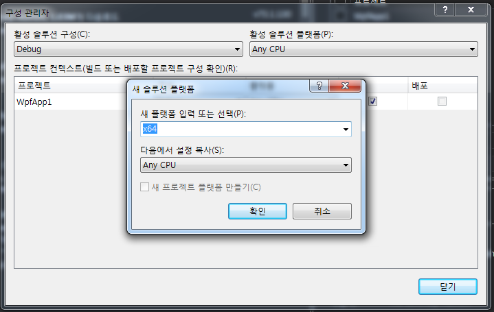 프로젝트 구성관리자 지정하기 x86 또는 x64 하나만 지정해야됨